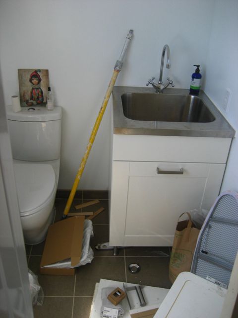 After much procrastination, the half bath finally got a tidying up. We added a sliding shelf below the utility sink and a bar with hooks for organizing the brooms and mop. I like how it keeps everything off the floor and neat looking. The round mirror was a lucky estate sale find. My dad made the little wooden stool between the sink and toilet. I plan to put a coat a paint on it one of these days. :)